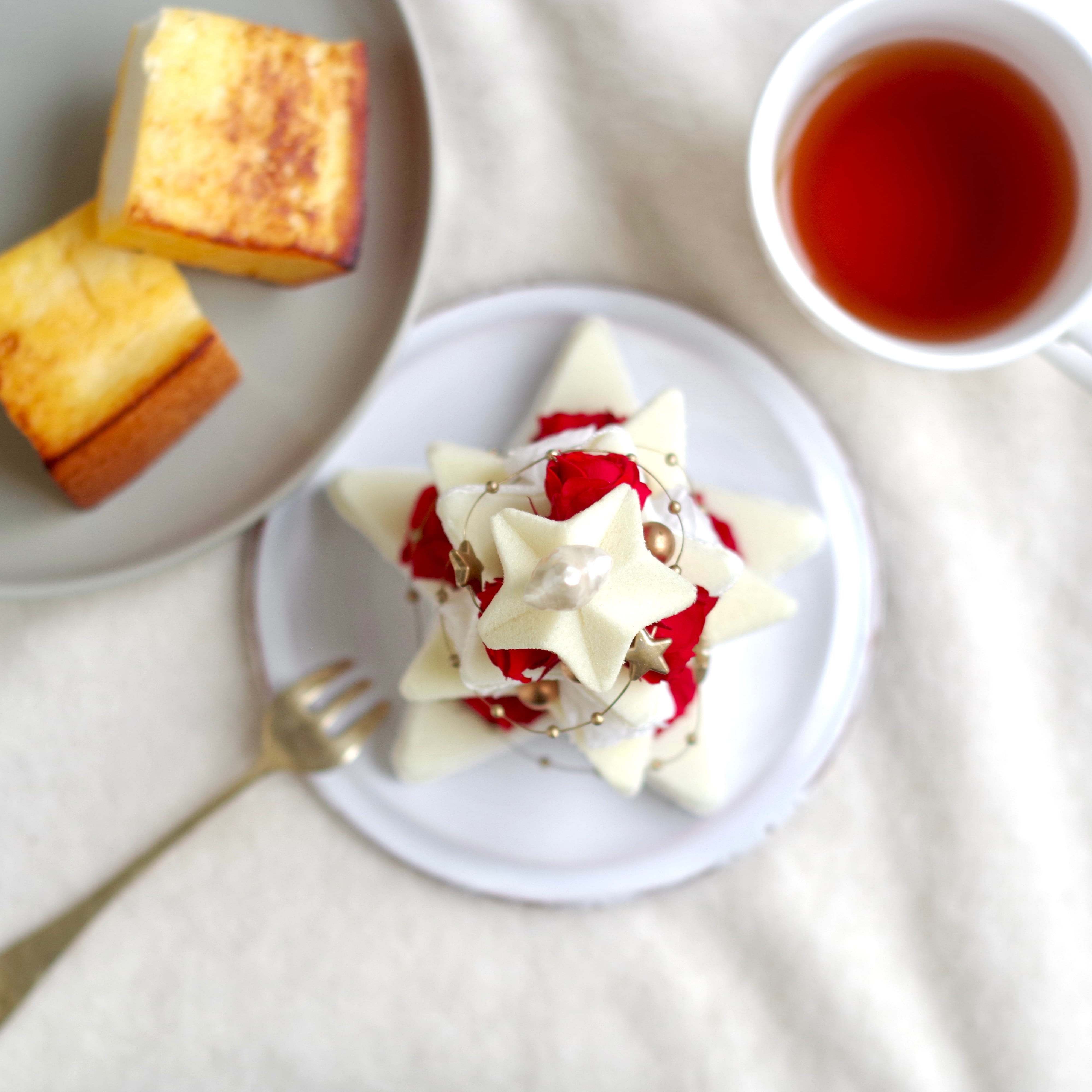 大小の星形にくりぬいたパンケーキ。間にはベリーやホイップクリームをはさんで。そんな特別な日のパンケーキタワーをイメージして作りました。