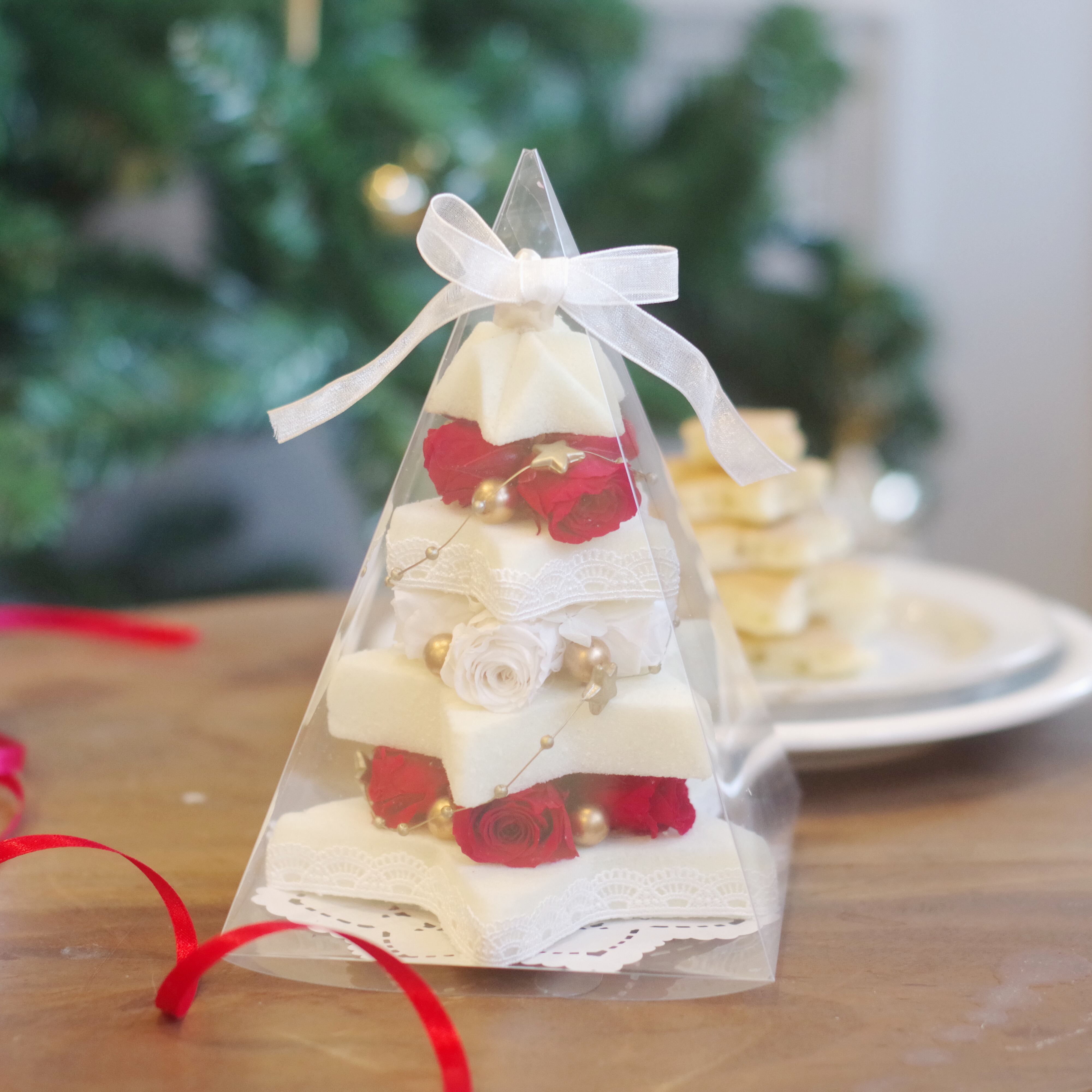 ピラミッド型のクリアケースに入れてリボンをかけてお届けします。