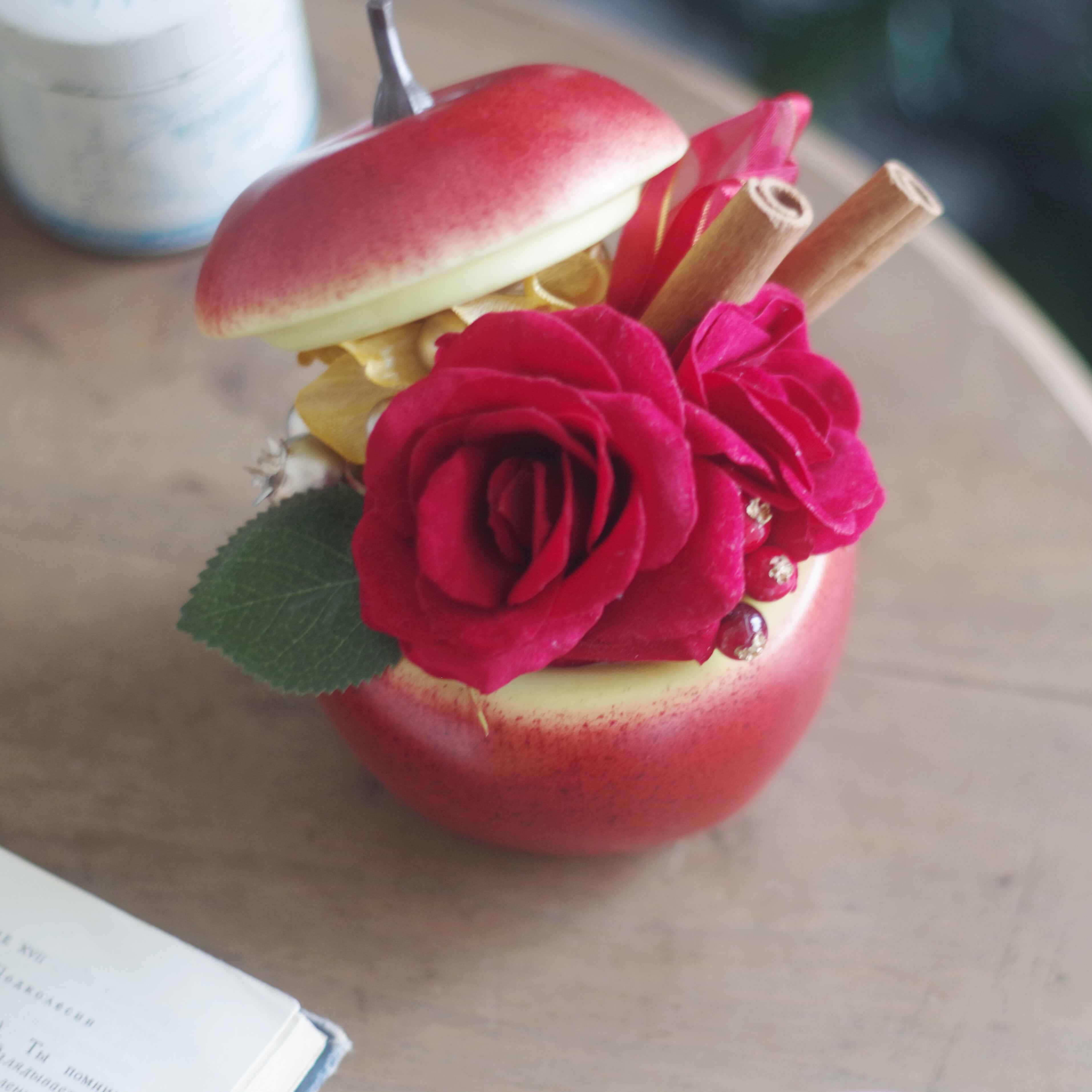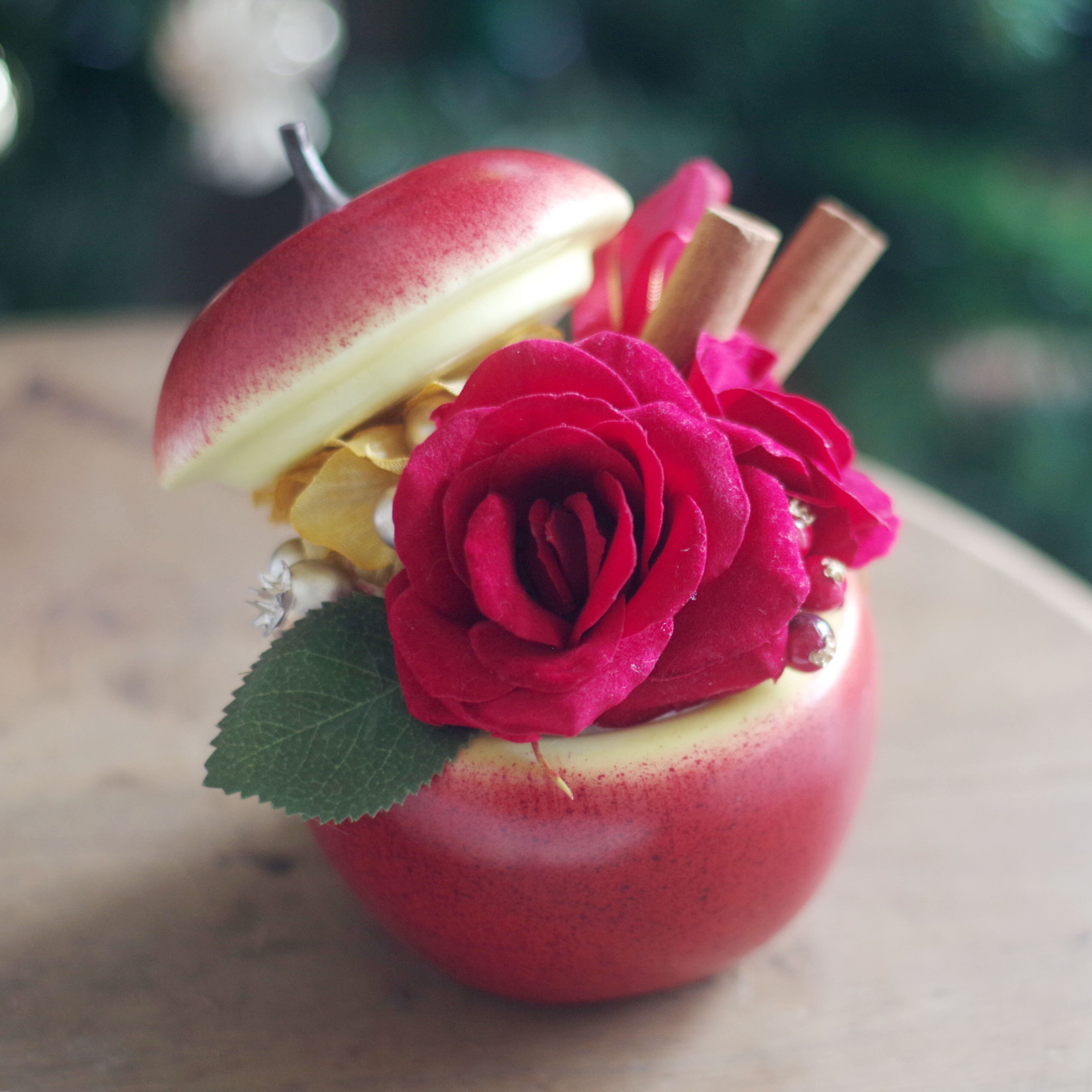 ころんとしたかわいらしいりんごの器に、ベルベットのような真っ赤なバラ。