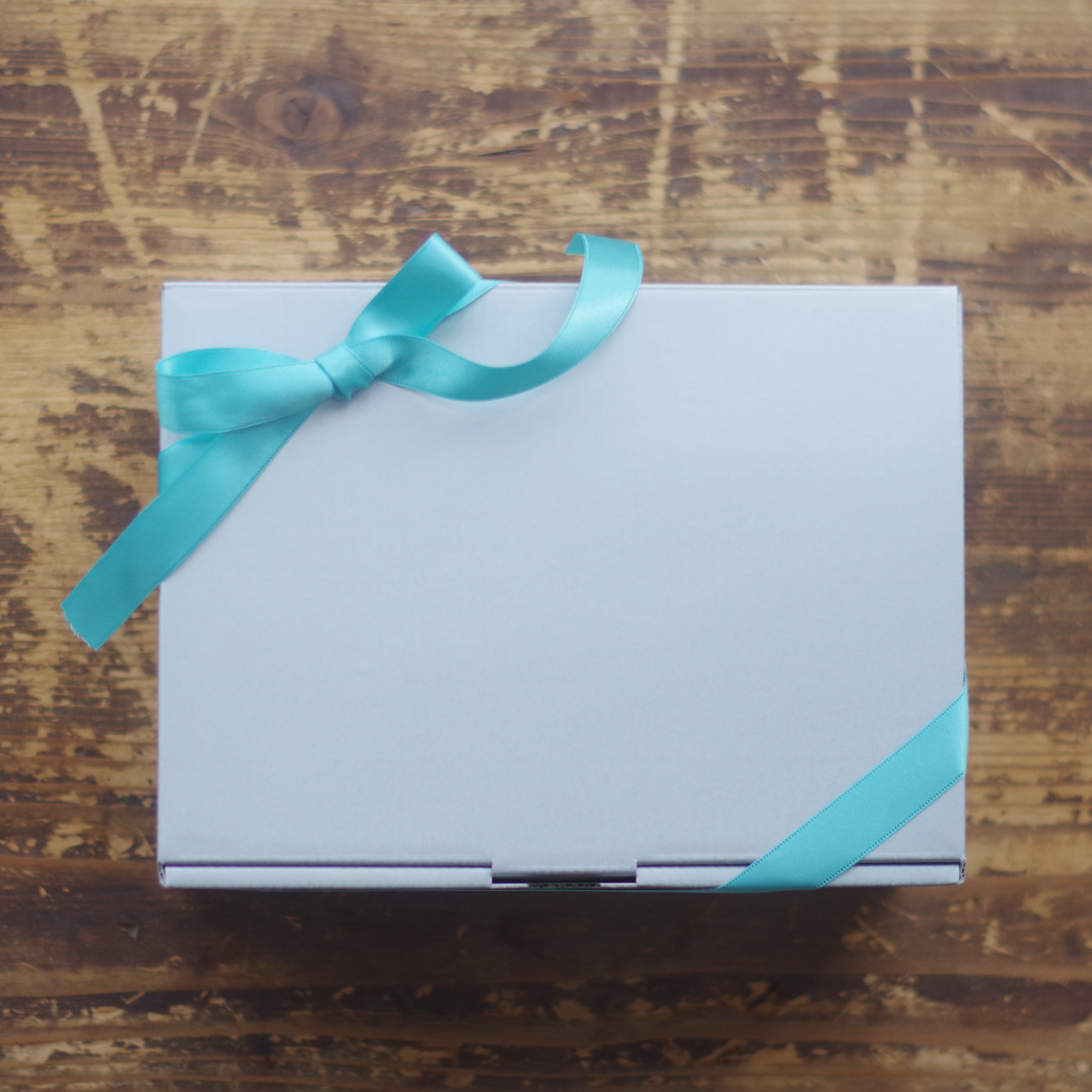 シルバーグレーのボックスにリボンをかけてお届けします。